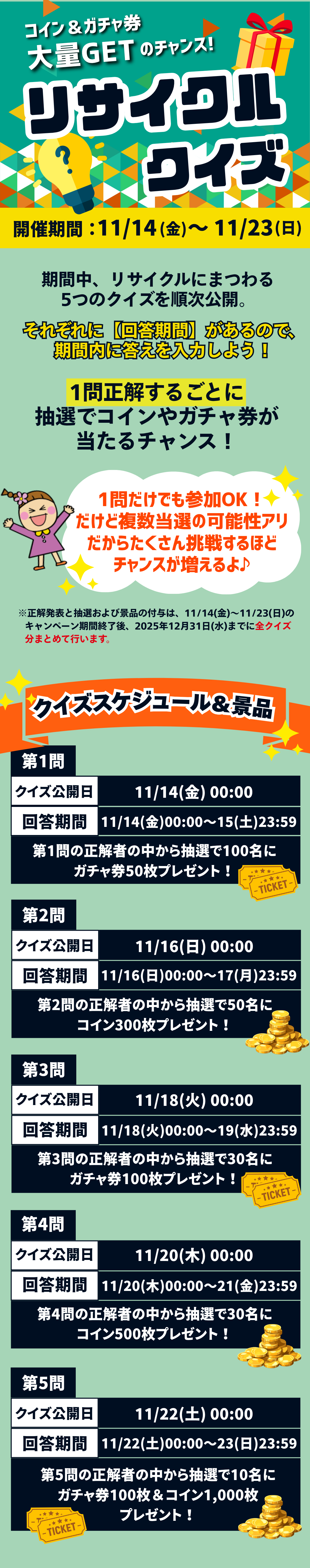 【第1問公開中】コイン&ガチャ券大量GETのチャンス!リサイクルクイズ
