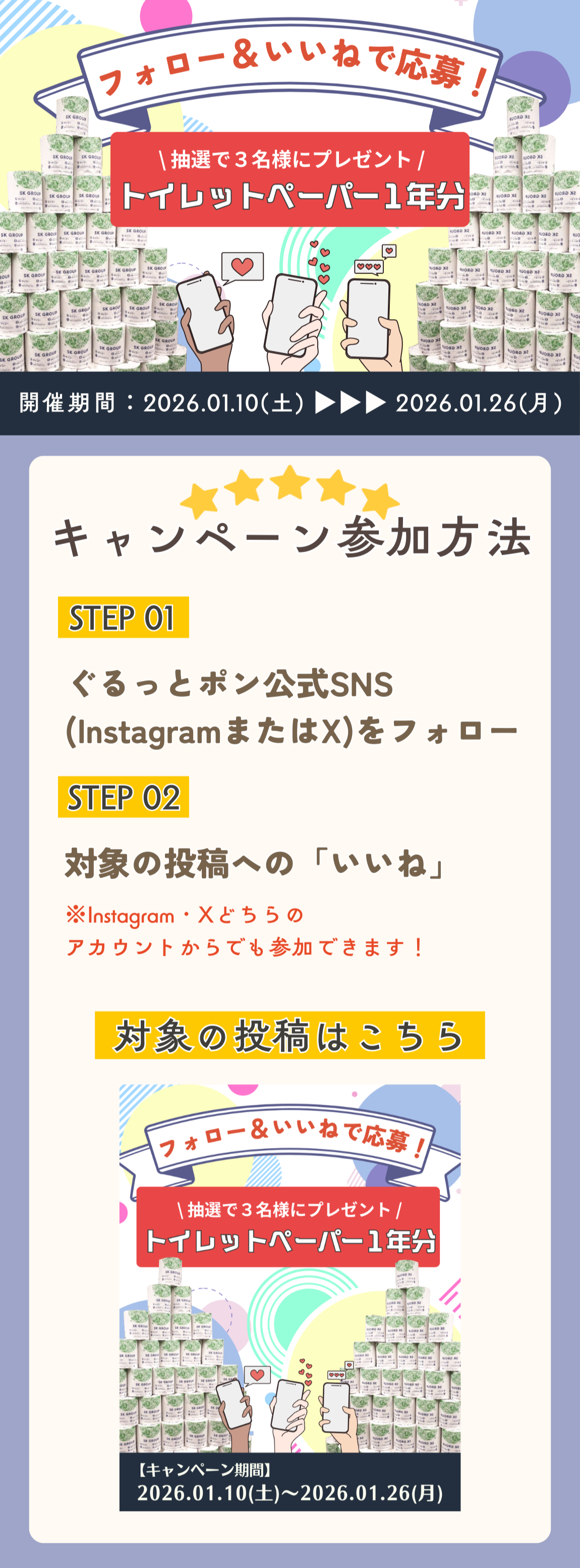 📱公式のSNSをフォローしてトイレットペーパー1年分をゲットしよう!📱
