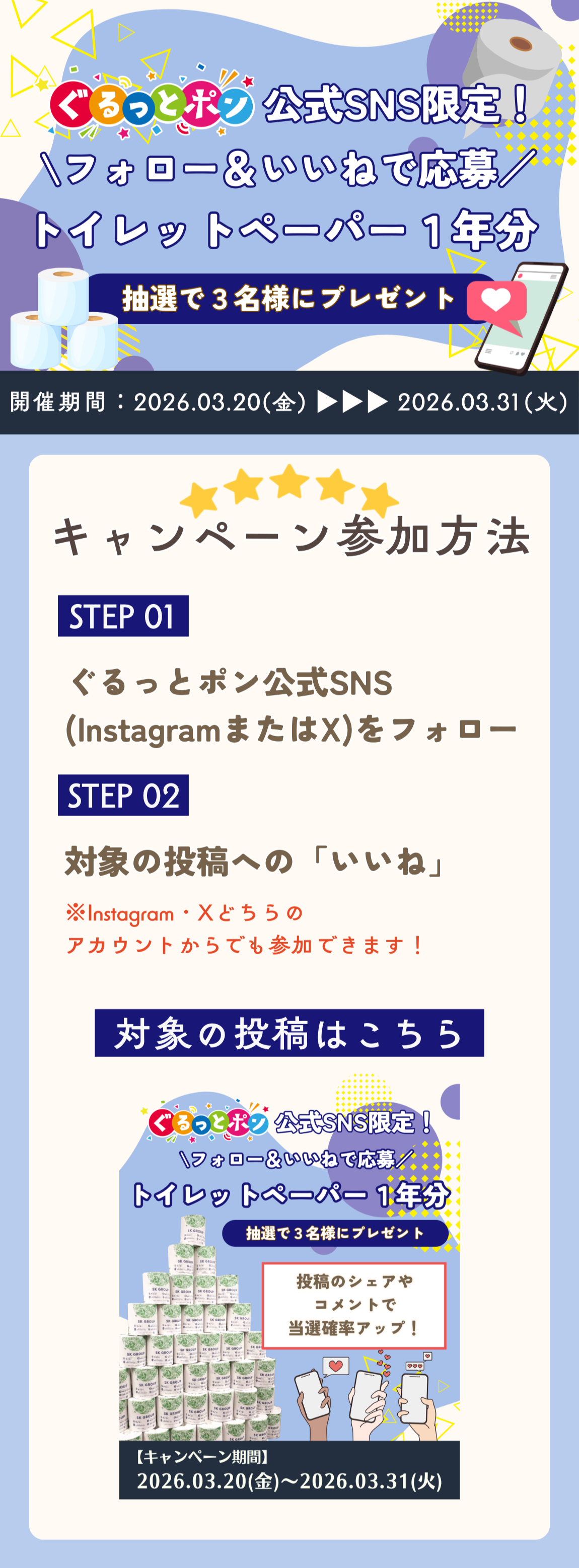 ・景品/当選人数:抽選で3名様に「トイレットペーパー1年分」プレゼント