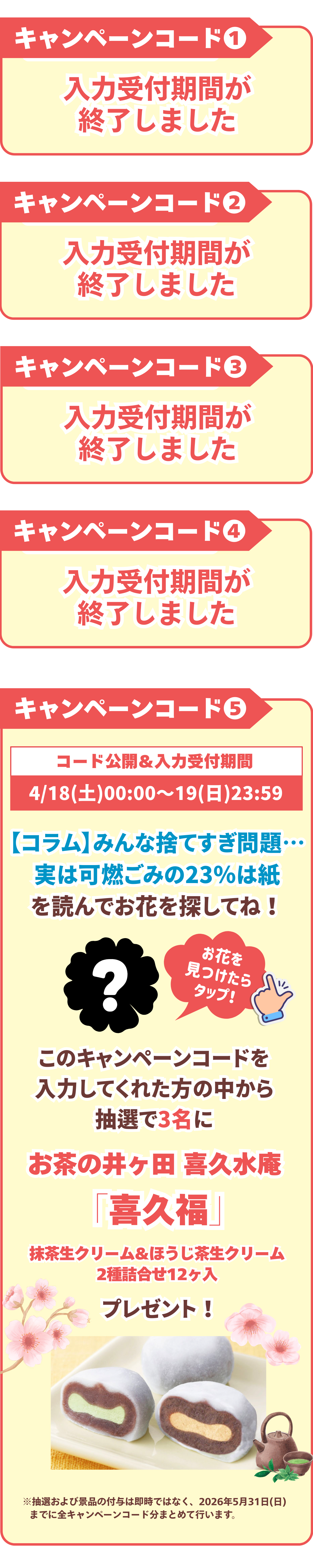 ■ 景品の抽選は、全5種のキャンペーンコードごとに抽選を行い当選者を決定します。複数種類のキャンペーンコードに応募(キャンペーンコード入力)されているユーザー様は、複数当選する可能性がございます。